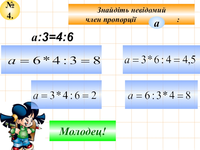 № 4.Знайдіть невідомий член пропорції           :Подумай!Молодец!а а:3=4:6