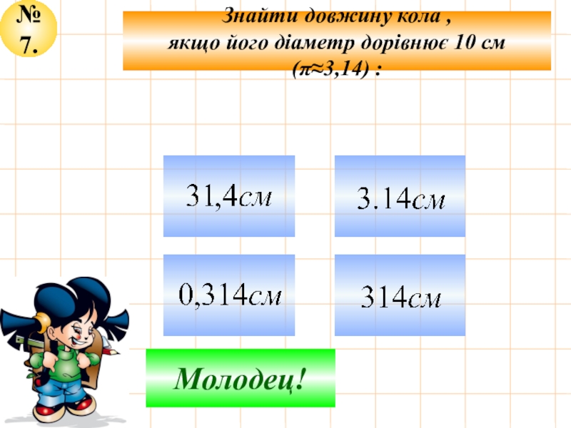 № 7.Не верно!Молодец!Знайти довжину кола , якщо його діаметр дорівнює 10 см (π≈3,14) :