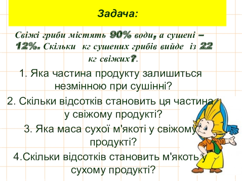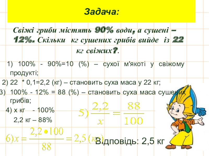 Задача:Свіжі гриби містять 90% води, а сушені – 12%. Скільки кг сушених грибів вийде із 22 кг