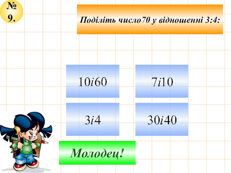 № 9.Не верно!Молодец!Поділіть число70 у відношенні 3:4: