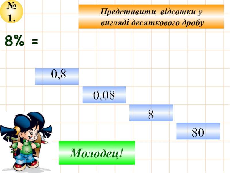 № 1.Представити відсотки у вигляді десяткового дробуНе верно!Молодец!8% =