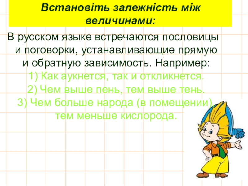 Встановіть залежність між величинами: В русском языке встречаются пословицы и поговорки, устанавливающие прямую и обратную зависимость. Например: