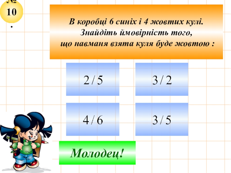 № 10.Не верно!Молодец!В коробці 6 синіх і 4 жовтих кулі. Знайдіть ймовірність того, що навманя взята куля
