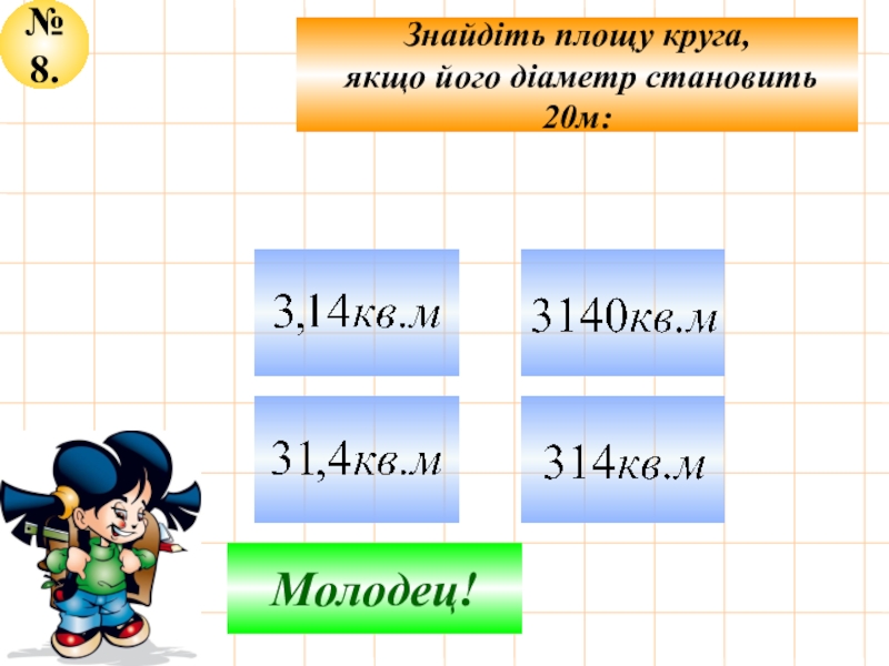№ 8.Не верно!Молодец!Знайдіть площу круга, якщо його діаметр становить 20м: