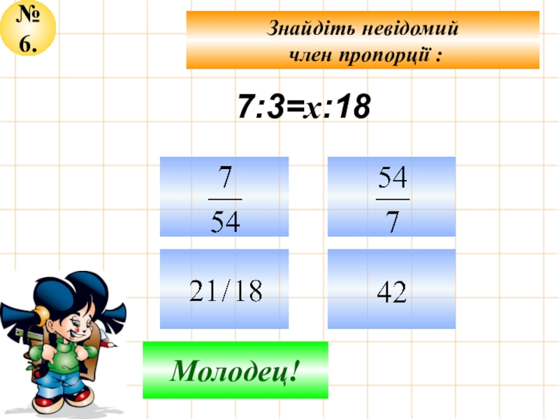 № 6.Не верно!Молодец!Знайдіть невідомий член пропорції :7:3=х:18