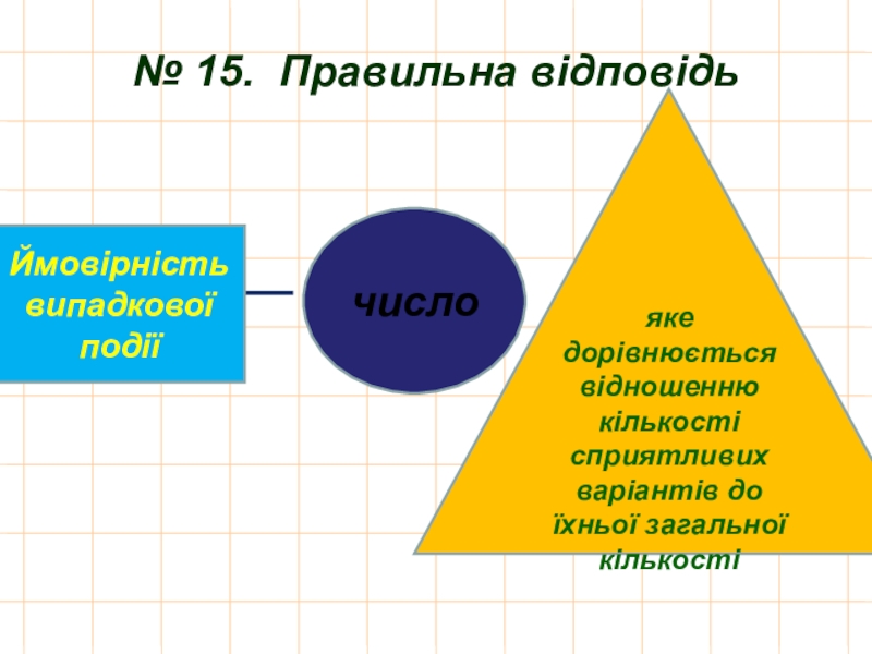 № 15. Правильна відповідьчислоЙмовірність випадкової подіїяке дорівнюється відношенню кількості сприятливих варіантів до їхньої загальної кількості
