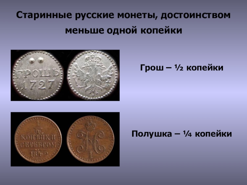 Слайд 16Старинные русские монеты, достоинством меньше одной копейки