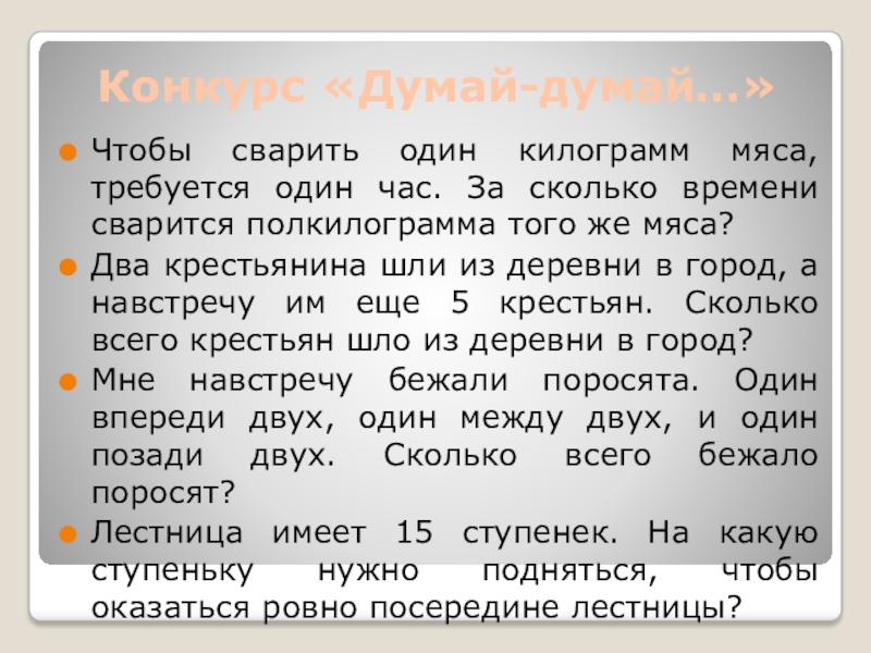 Конкурс «Думай-думай…»Чтобы сварить один килограмм мяса, требуется один час. За сколько времени сварится полкилограмма того же мяса?Два