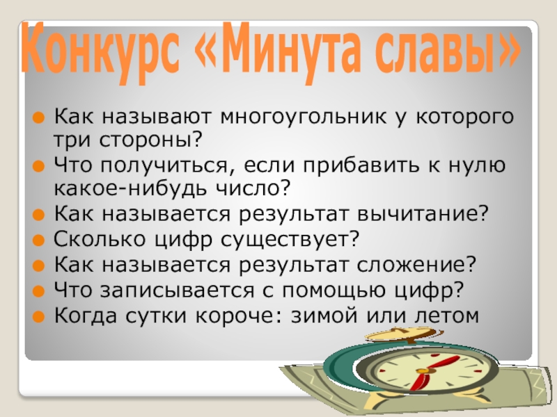 Конкурс «Минута славы»Как называют многоугольник у которого три стороны? Что получиться, если прибавить к нулю какое-нибудь число?Как