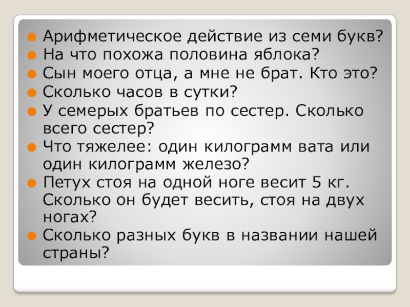 Арифметическое действие из семи букв?На что похожа половина яблока?Сын моего отца, а мне не брат. Кто это?Сколько