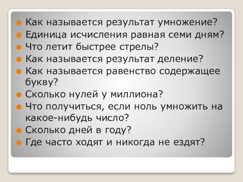 Как называется результат умножение?Единица исчисления равная семи дням?Что летит быстрее стрелы?Как называется результат деление?Как называется равенство содержащее