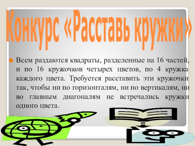 Конкурс «Расставь кружки»Всем раздаются квадраты, разделенные на 16 частей, и по 16 кружочков четырех цветов, по 4