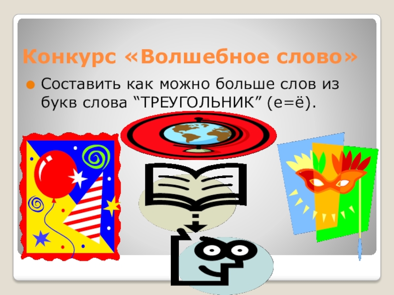 Конкурс «Волшебное слово»Составить как можно больше слов из букв слова “ТРЕУГОЛЬНИК” (е=ё).