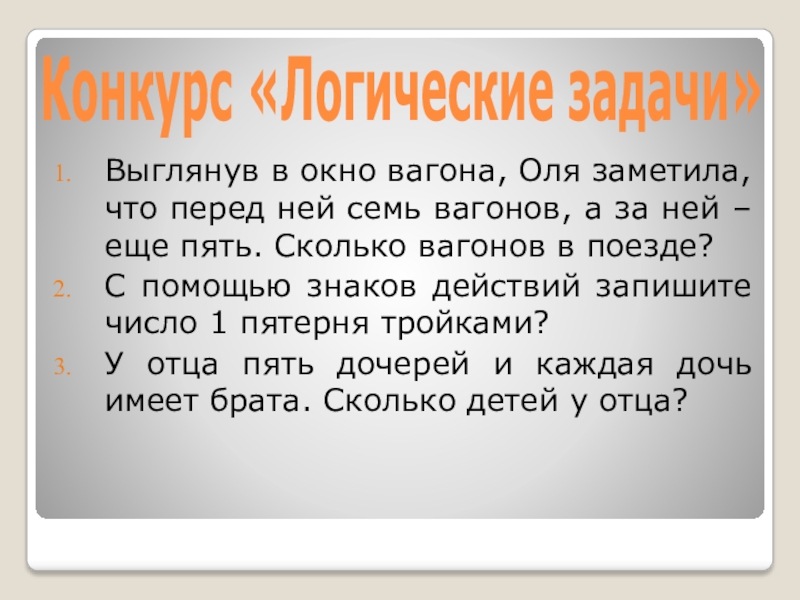 Конкурс «Логические задачи»Выглянув в окно вагона, Оля заметила, что перед ней семь вагонов, а за ней –