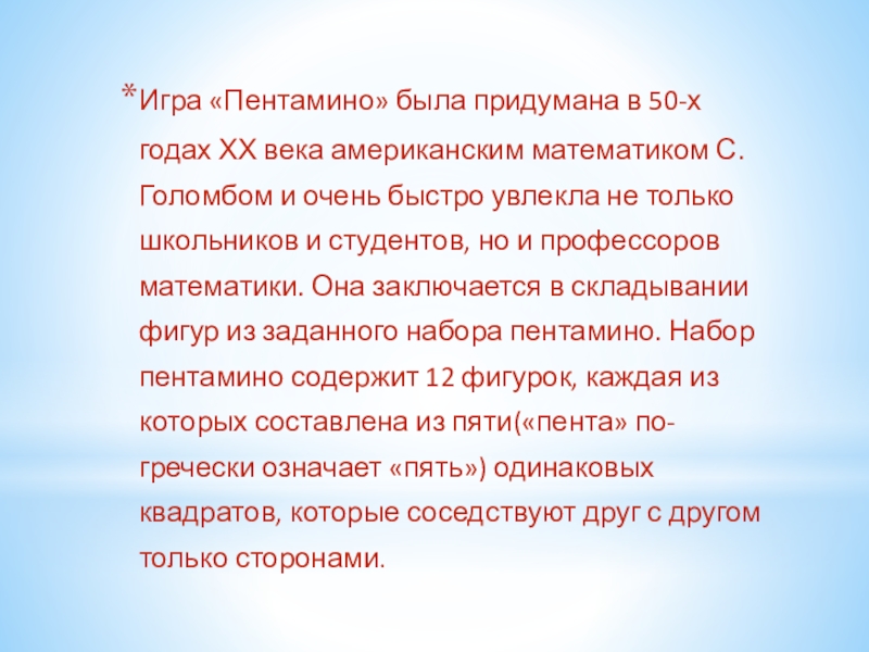Игра «Пентамино» была придумана в 50-х годах ХХ века американским математиком С.Голомбом и очень быстро увлекла не