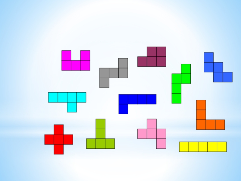 С.Голомбом и очень быстро увлекла не только школьников и студентов, но и профессоров математики. Она заключается в складывании фигур из заданного набора пентамино. Набор пентамино содержит 12 фигурок, каждая из которых составлена из пяти(«пента» по-гречески означает «пять») одинаковых квадратов, которые соседствуют друг с другом только сторонами.