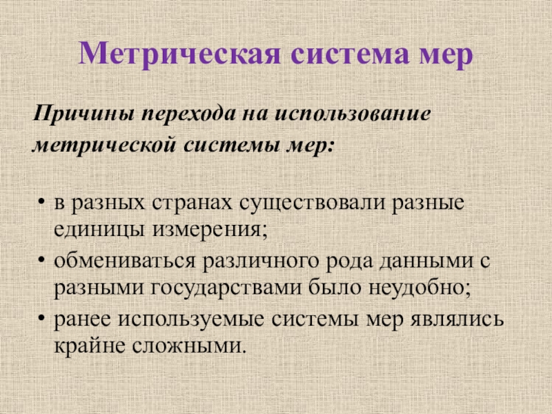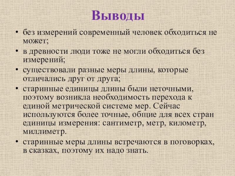 старинные единицы длины были неточными, поэтому возникла необходимость перехода к единой метрической системе мер. Сейчас используются более точные, общие для всех стран единицы измерения: сантиметр, метр, километр, миллиметр.