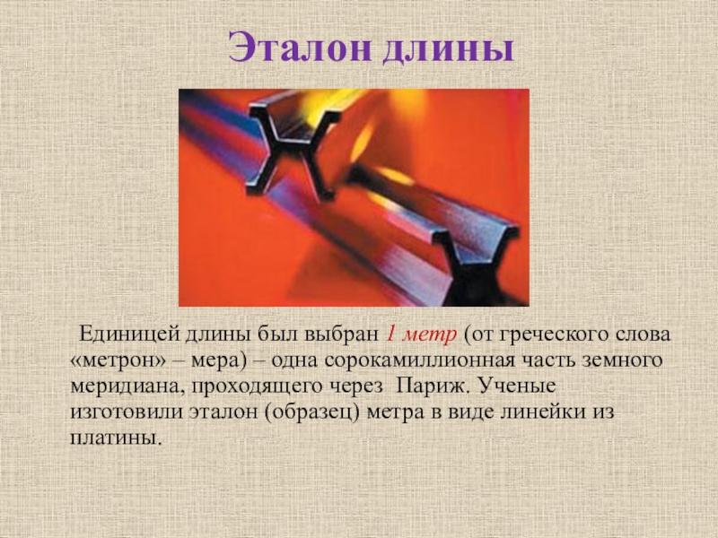 – мера) – одна сорокамиллионная часть земного меридиана, проходящего через Париж. Ученые изготовили эталон (образец) метра в виде линейки из платины.