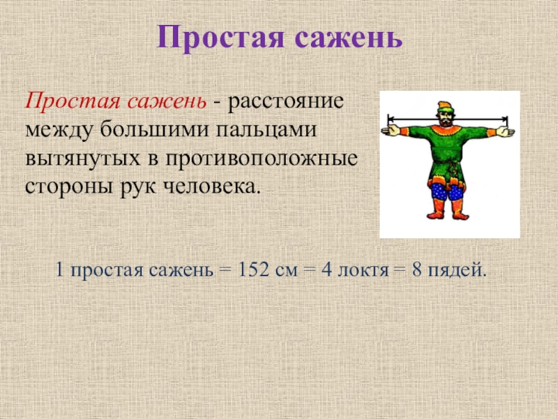 1 простая сажень = 152 см = 4 локтя = 8 пядей.