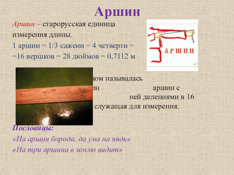 Аршином называлась линейка длиною в один аршин с нанесёнными на ней делениями в 16 вершков, служащая для измерения.