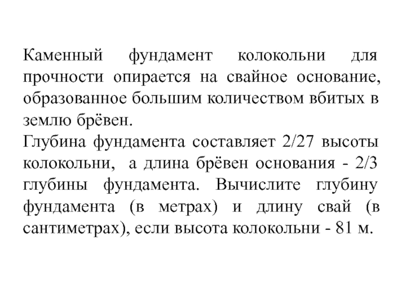 Глубина фундамента составляет 2/27 высоты колокольни, а длина брёвен основания - 2/3 глубины фундамента. Вычислите глубину фундамента (в метрах) и длину свай (в сантиметрах), если высота колокольни - 81 м.