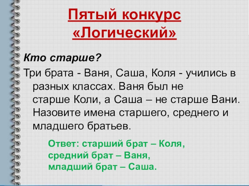 Ответ: старший брат – Коля, средний брат – Ваня, младший брат – Саша.