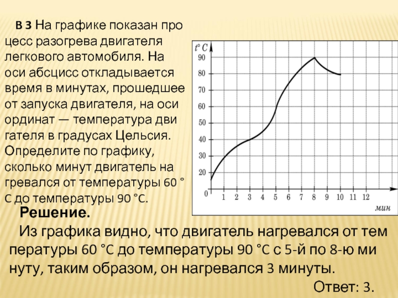 Из графика видно, что двигатель нагревался от температуры 60 °C до температуры 90 °C с 5-й по 8-ю минуту, таким образом, он нагревался 3 минуты.