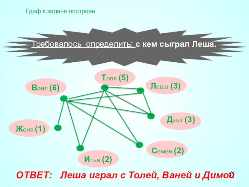 Слайд 51ОТВЕТ: Леша играл с Толей, Ваней и Димой