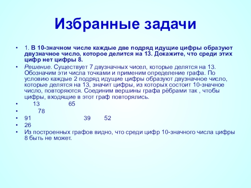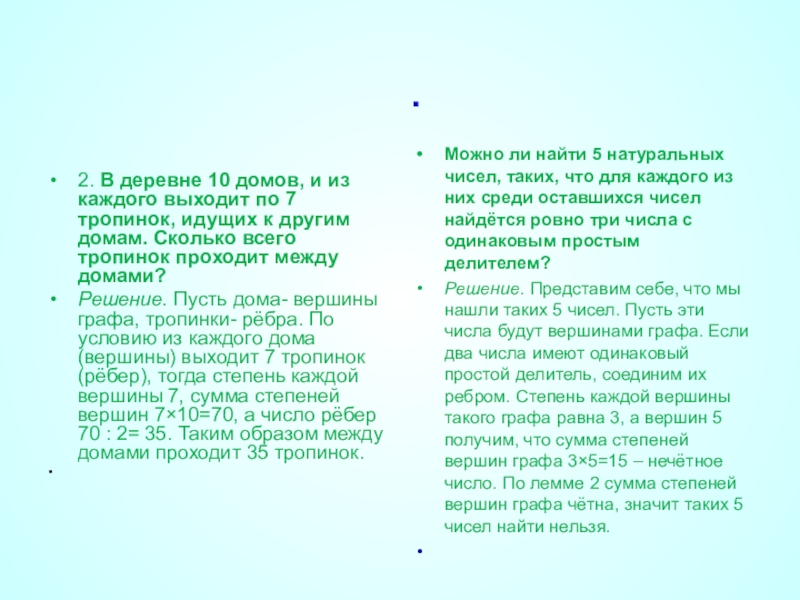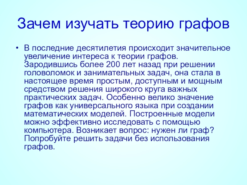 теории графов. Зародившись более 200 лет назад при решении головоломок и занимательных задач, она стала в настоящее время простым, доступным и мощным средством решения широкого круга важных практических задач. Особенно велико значение графов как универсального языка при создании математических моделей. Построенные модели можно эффективно исследовать с помощью компьютера. Возникает вопрос: нужен ли граф? Попробуйте решить задачи без использования графов.
