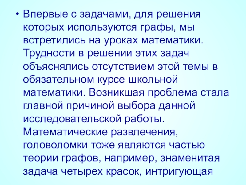 уроках математики. Трудности в решении этих задач объяснялись отсутствием этой темы в обязательном курсе школьной математики. Возникшая проблема стала главной причиной выбора данной исследовательской работы. Математические развлечения, головоломки тоже являются частью теории графов, например, знаменитая задача четырех красок, интригующая