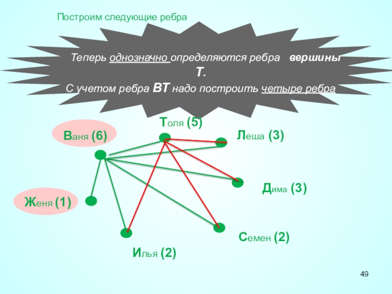 Слайд 49Теперь однозначно определяются ребра вершины Т.