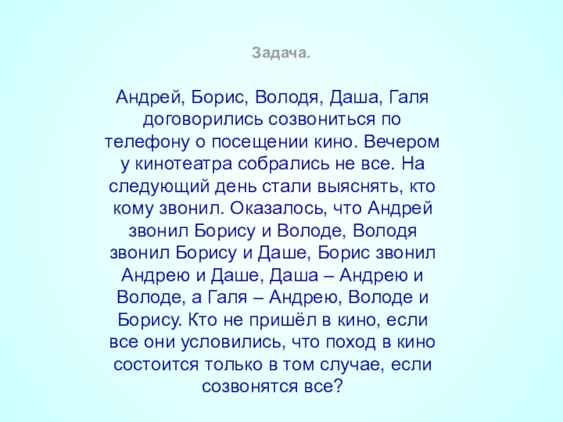 кино. Вечером у кинотеатра собрались не все. На следующий день стали выяснять, кто кому звонил. Оказалось, что Андрей звонил Борису и Володе, Володя звонил Борису и Даше, Борис звонил Андрею и Даше, Даша – Андрею и Володе, а Галя – Андрею, Володе и Борису. Кто не пришёл в кино, если все они условились, что поход в кино состоится только в том случае, если созвонятся все?