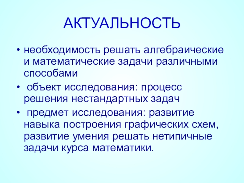 предмет исследования: развитие навыка построения графических схем, развитие умения решать нетипичные задачи курса математики.