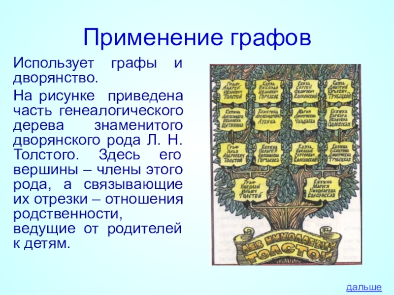 дворянского рода Л. Н. Толстого. Здесь его вершины – члены этого рода, а связывающие их отрезки – отношения родственности, ведущие от родителей к детям.