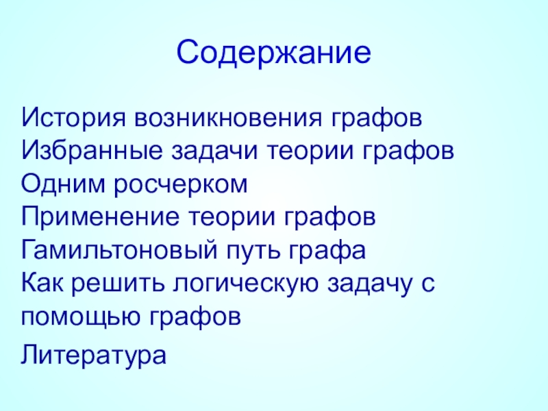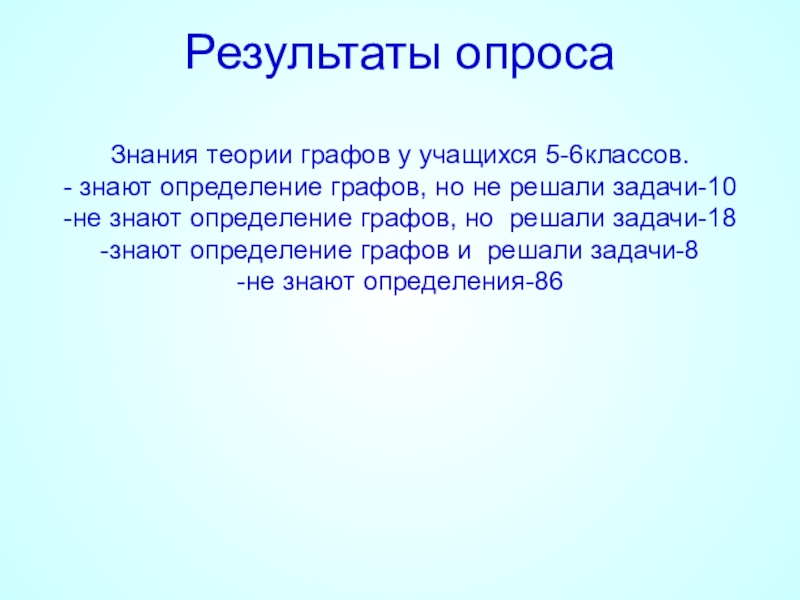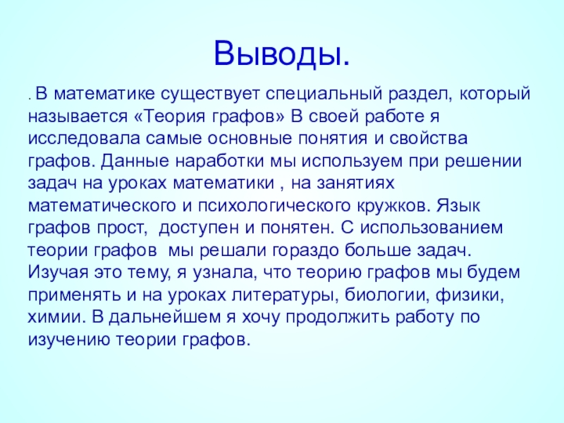 своей работе я исследовала самые основные понятия и свойства графов. Данные наработки мы используем при решении задач на уроках математики , на занятиях математического и психологического кружков. Язык графов прост, доступен и понятен. С использованием теории графов мы решали гораздо больше задач. Изучая это тему, я узнала, что теорию графов мы будем применять и на уроках литературы, биологии, физики, химии. В дальнейшем я хочу продолжить работу по изучению теории графов.
