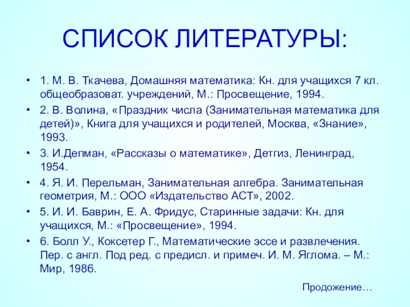 2. В. Волина, «Праздник числа (Занимательная математика для детей)», Книга для учащихся и родителей, Москва, «Знание», 1993.