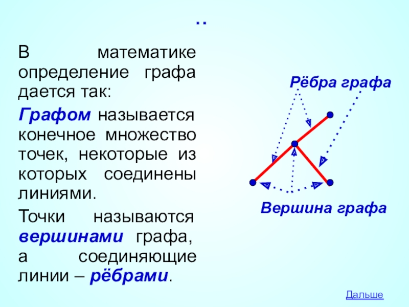 точек, некоторые из которых соединены линиями. В процессе решения задач математики заметили, что удобно изображать объекты точками, а отношения между ними отрезками или дугами.