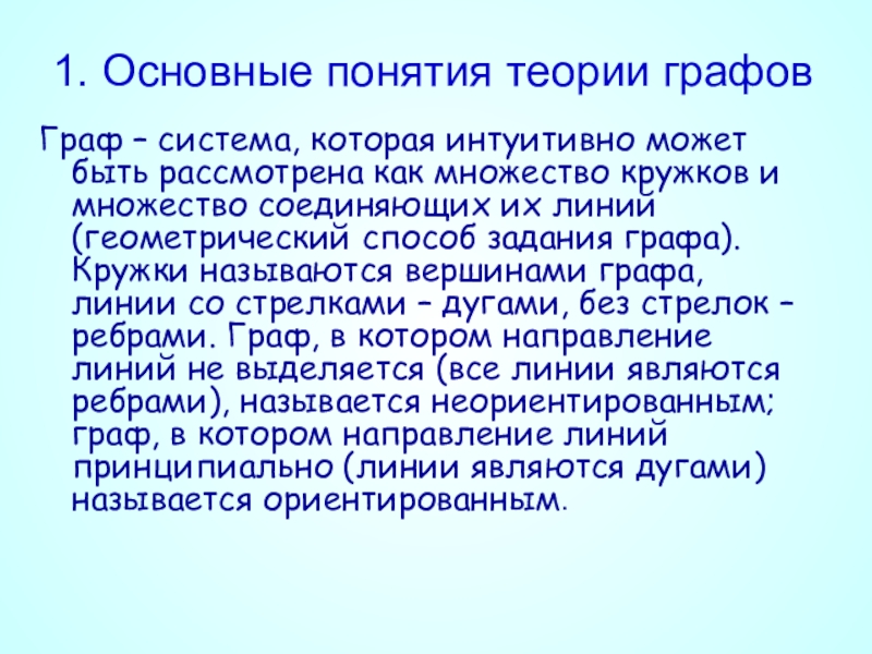 рассмотрена как множество кружков и множество соединяющих их линий (геометрический способ задания графа). Кружки называются вершинами графа, линии со стрелками – дугами, без стрелок – ребрами. Граф, в котором направление линий не выделяется (все линии являются ребрами), называется неориентированным; граф, в котором направление линий принципиально (линии являются дугами) называется ориентированным.