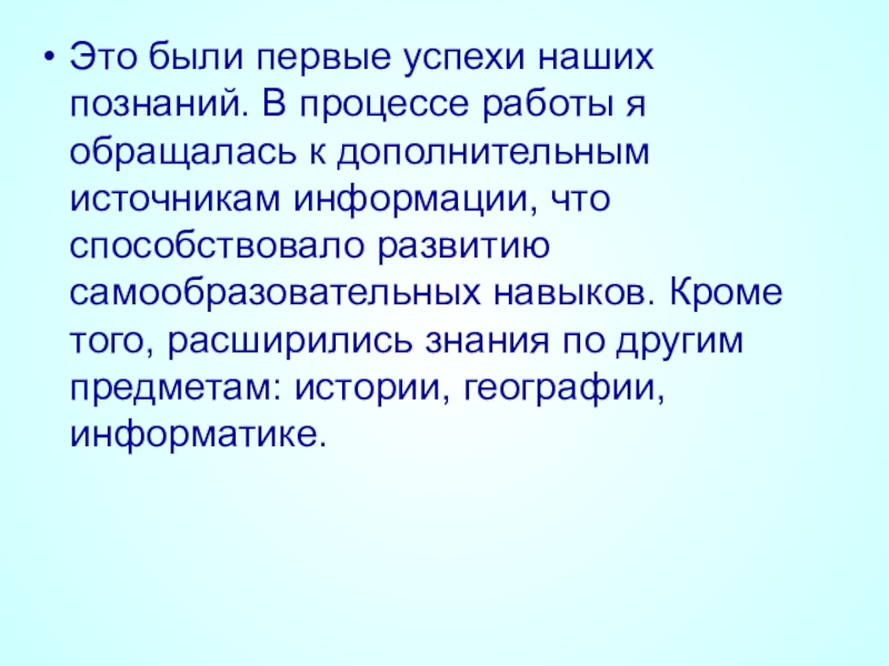 Слайд 5Это были первые успехи наших познаний. В процессе работы я обращалась