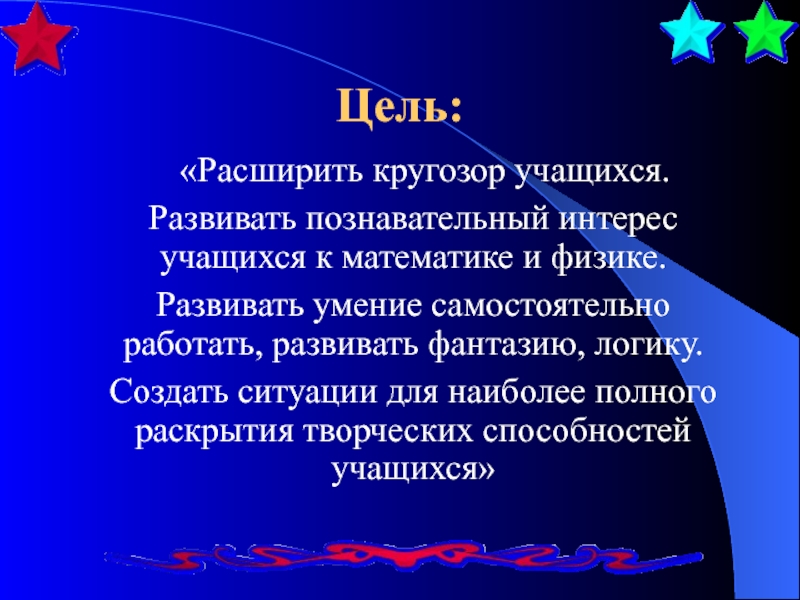 Цель: «Расширить кругозор учащихся.Развивать познавательный интерес учащихся к математике и физике.Развивать умение самостоятельно работать, развивать фантазию, логику.Создать ситуации для наиболее полного раскрытия творческих способностей учащихся»