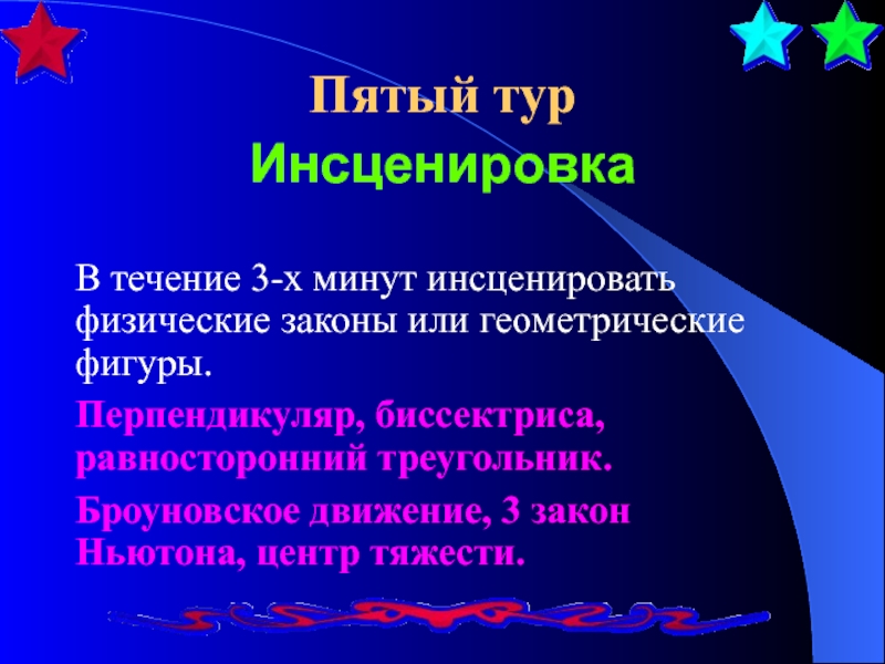 Пятый турИнсценировкаВ течение 3-х минут инсценировать физические законы или геометрические фигуры.Перпендикуляр, биссектриса, равносторонний треугольник.Броуновское движение, 3 закон