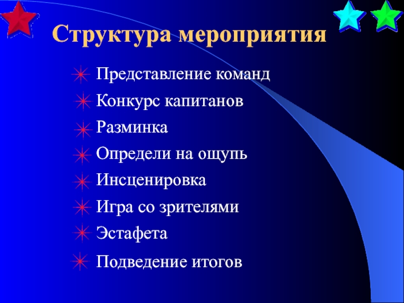 Структура мероприятияПредставление командКонкурс капитановРазминкаОпредели на ощупьИнсценировкаИгра со зрителямиЭстафетаПодведение итогов