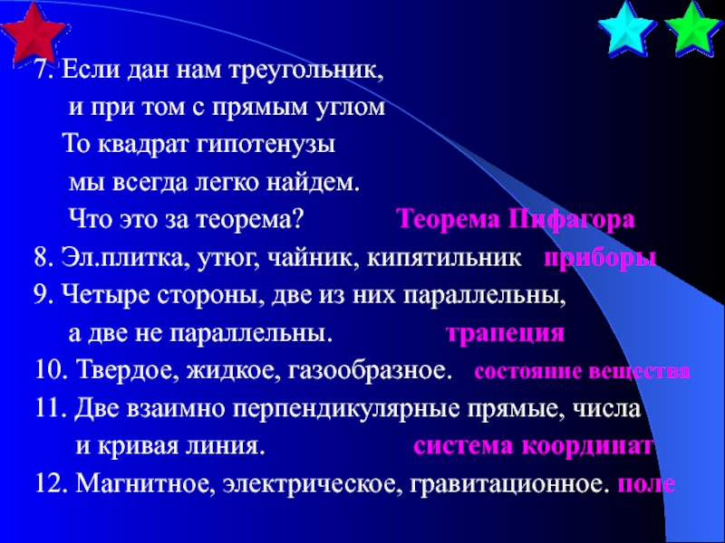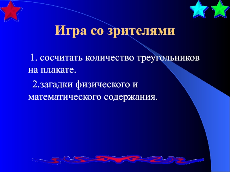 Игра со зрителями  1. сосчитать количество треугольников на плакате.   2.загадки физического и математического содержания.