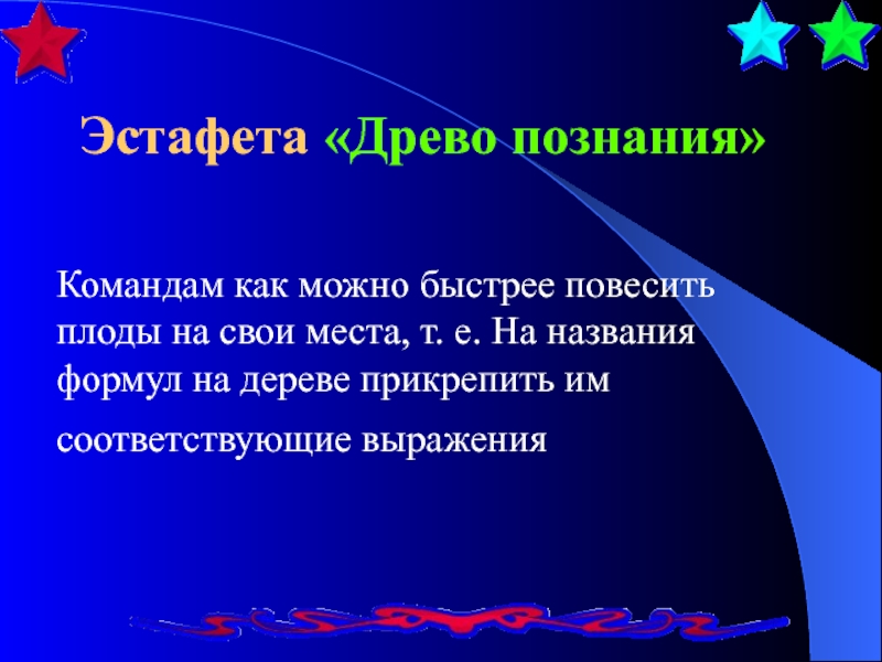 Эстафета «Древо познания»Командам как можно быстрее повесить плоды на свои места, т. е. На названия формул на дереве