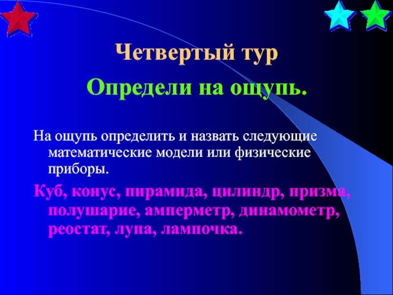 Четвертый турОпредели на ощупь.На ощупь определить и назвать следующие математические модели или физические приборы.Куб, конус, пирамида, цилиндр,