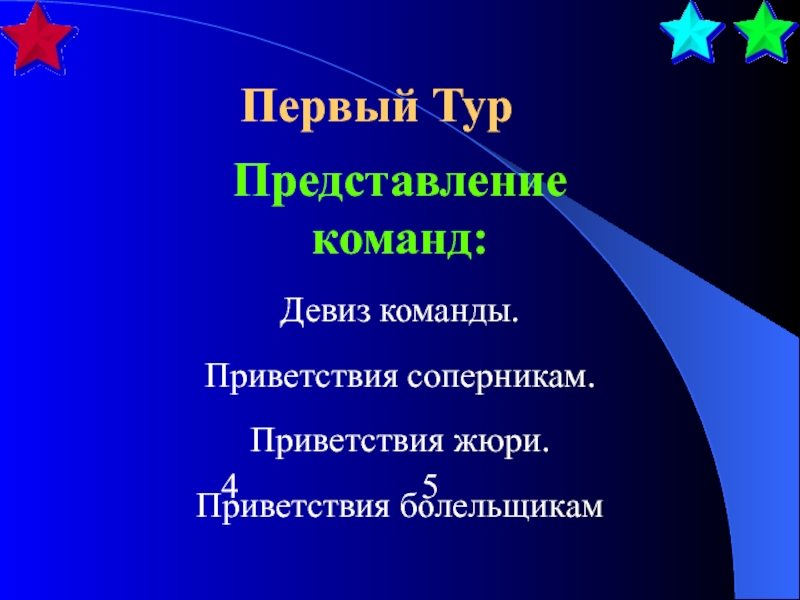 Первый Тур   45Представление команд:Девиз команды.Приветствия соперникам.Приветствия жюри.Приветствия болельщикам