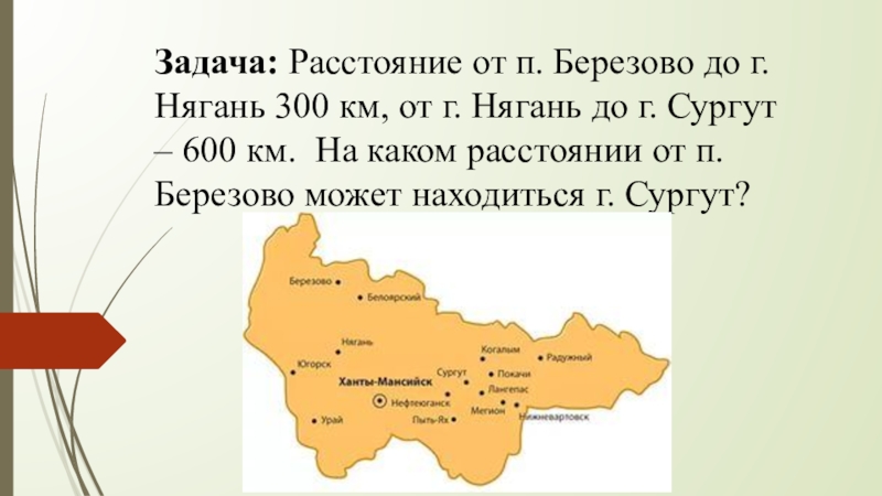 Слайд 4Задача: Расстояние от п. Березово до г. Нягань 300 км, от