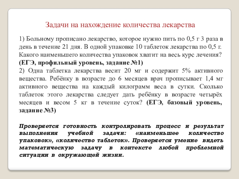 Проверяется готовность контролировать процесс и результат выполнения учебной задачи: «наименьшее количество упаковок», «количество таблеток». Проверяется умение видеть математическую задачу в контексте любой проблемной ситуации в окружающей жизни.