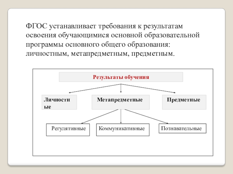 Слайд 2ФГОС устанавливает требования к результатам освоения обучающимися основной образовательной программы основного