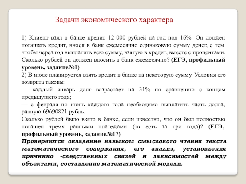 год под 16%. Он должен погашать кредит, внося в банк ежемесячно одинаковую сумму денег, с тем чтобы через год выплатить всю сумму, взятую в кредит, вместе с процентами. Сколько рублей он должен вносить в банк ежемесячно? (ЕГЭ, профильный уровень, задание№1)